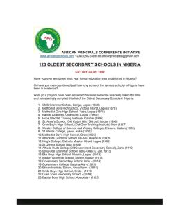 The 120 secondary schools that existed before Nigeria’s independence in 1960 are listed below: See also SSANU threatens fresh action over withheld salaries Post navigation PHOTOS: Pastor Adeboye, Wife Inducted as Boys, Girls Brigade PatronsCan Nigerians still withdraw their money on CBEX? — What you need to know