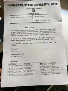 Meanwhile, the University in an internal memo from Students’ Disciplinary Committee to See Distribution titled: “Invitation”, which was signed by Dogo Bitrus Moni, PAR/HR Secretary, stated that they (affected students) were invited to appear before the Students’ Disciplinary Committee for fairness.